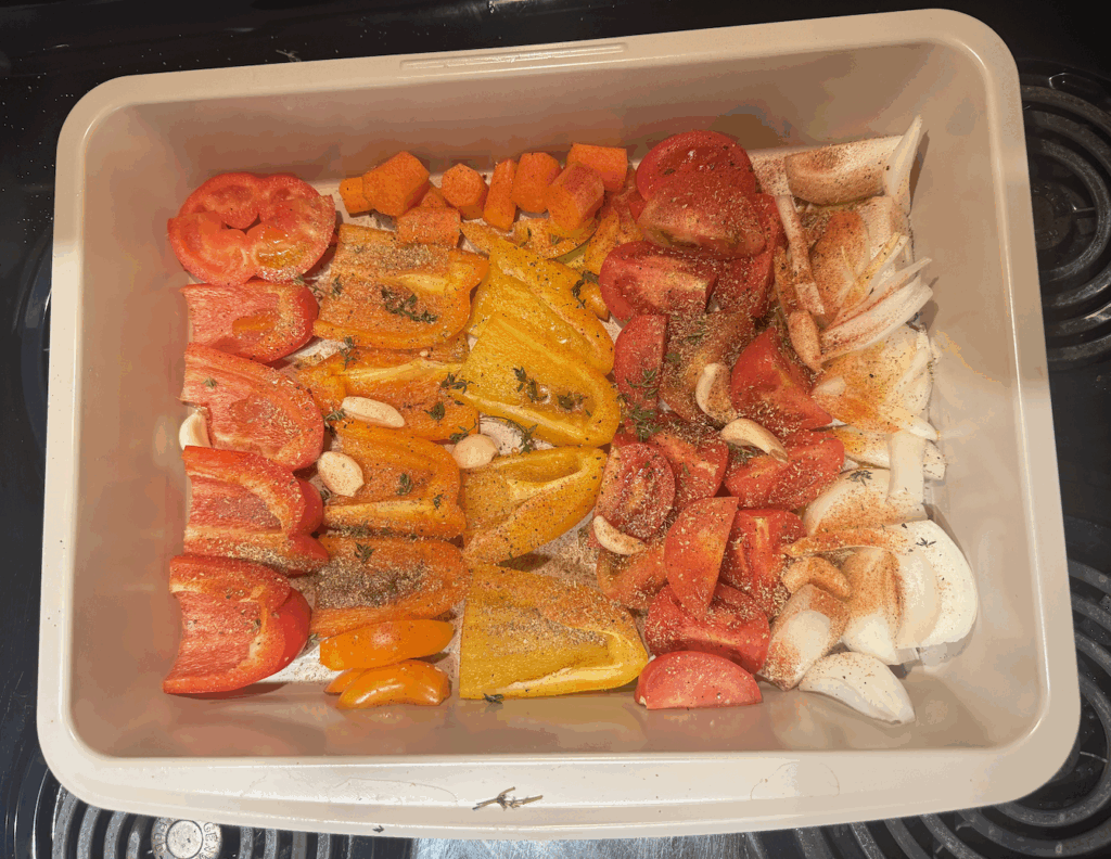 Step One: Pre-heat your oven to 400 degrees F. Halve or quarter your vegetables, assemble on a baking dish, and drizzle with olive oil and spices. Bake for 30-35 minutes.