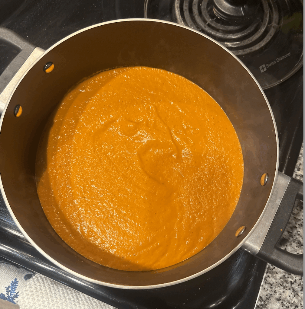 Step Two: Remove vegetables from the oven and add to a blender. Blend until smooth, adding chicken broth or water as needed to reach desired consistency.